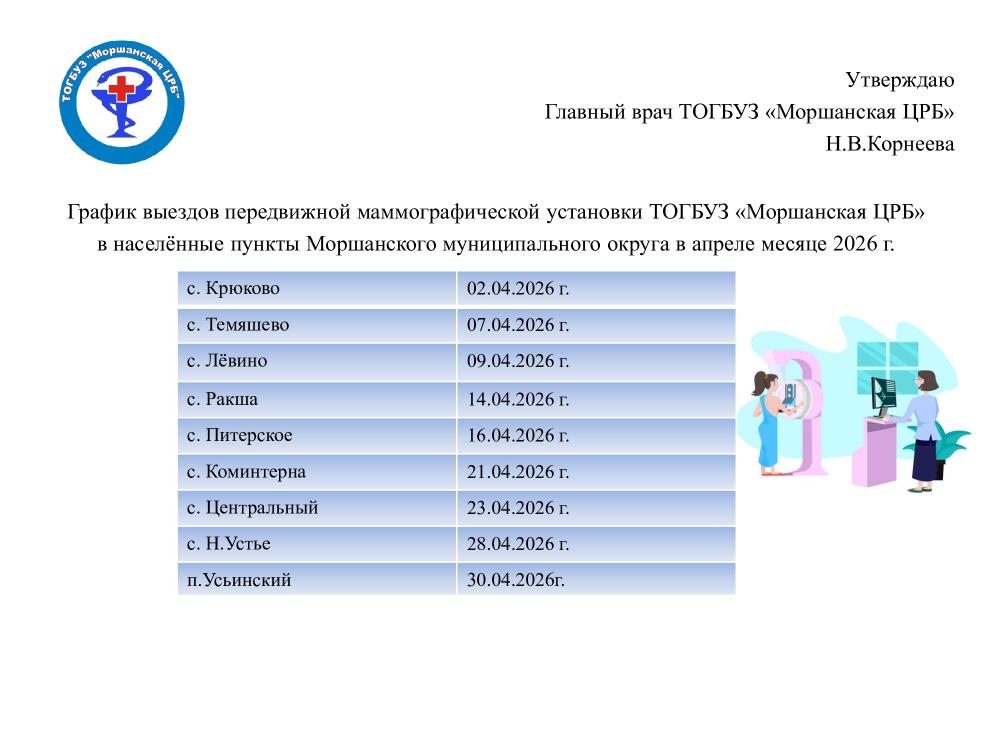 График выездов передвижной маммографической установки ТОГБУЗ «Моршанская ЦРБ» в населённые пункты Моршанского муниципального округа в апреле-мае месяце 2026 год.