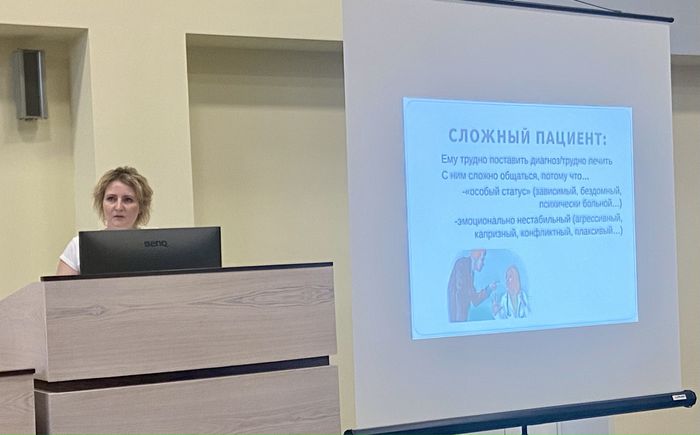 С докладом «Этические и психологические аспекты работы со сложными пациентами» выступила наша коллега — операционная медицинская сестра гинекологического отделения Устинова Юлия.