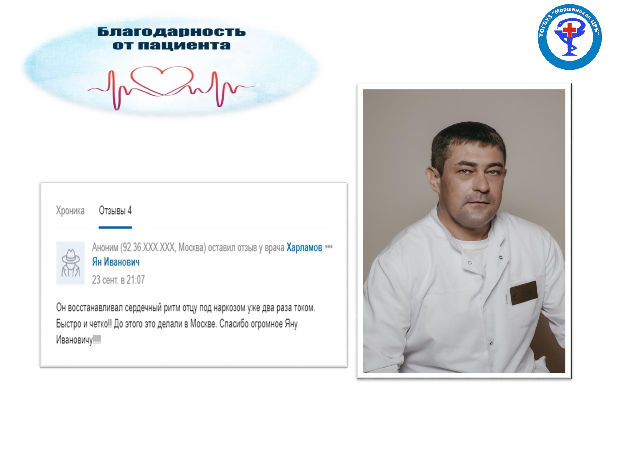 Напомним, что свой положительный отзыв о работе специалистов ТОГБУЗ «Моршанская ЦРБ» вы можете оставить: