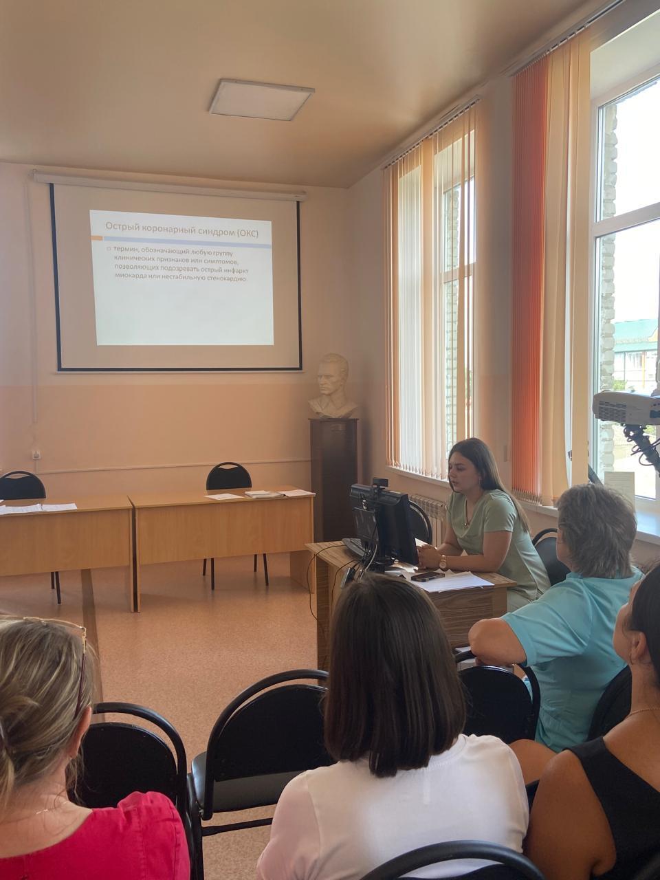Врач–терапевт участковый Иваньшина И.А. выступила с докладом: «Острый коронарный синдром». Острые коронарные синдромы (ОКС) представляют собой обострение стабильного течения ишемической болезни сердца и клинически проявляются формированием инфаркта миокарда, развитием нестабильной стенокардии или внезапной смерти. В своем выступлении Ирина Александровна уделила особое внимание диагностике и алгоритму оказания неотложной помощи в соответствии с клиническими рекомендациями, утверждёнными Минздравом РФ. Чем быстрее будет оказана помощь, тем меньше вероятность серьёзных повреждений сердца.