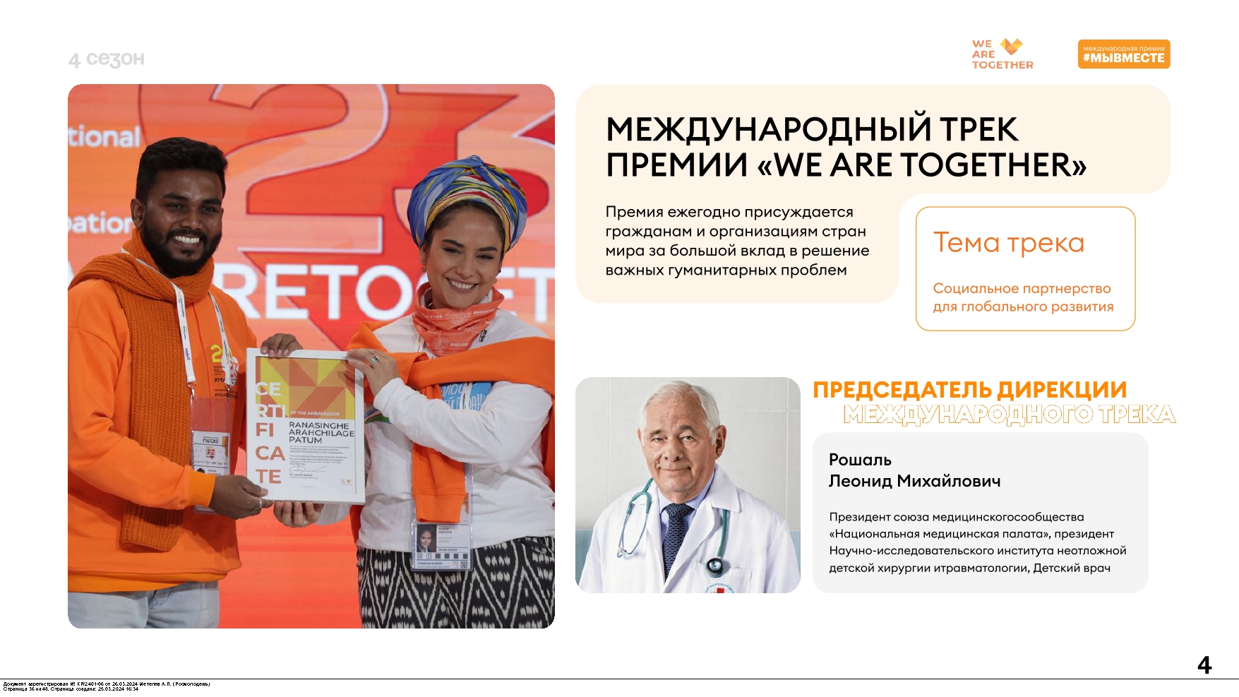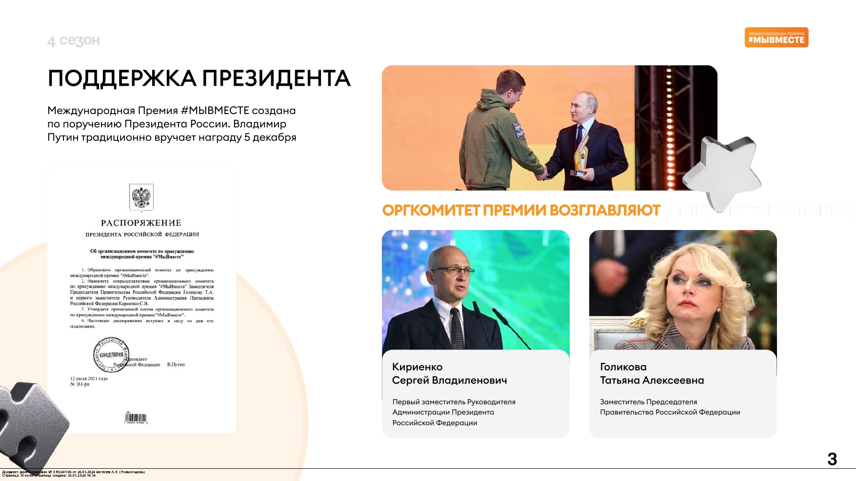 Международная премия «Мы вместе» реализуется при поддержке Президента России Владимира Путина. Главная цель — поддержать социальные инициативы, направленные на помощь людям и улучшение качества жизни.