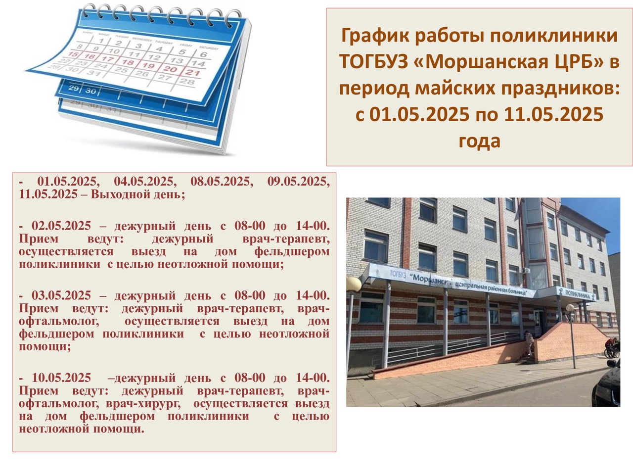 График работы поликлиники ТОГБУЗ "Моршанская ЦРБ" в период майских праздников: с 01.05.2055 года по 11.05.2025 года